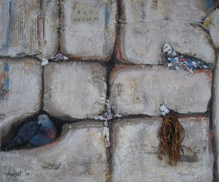 Het tweede schilderij van de serie KLAAGMUUR is de samenvatting van de beide andere en is gemaakt naar aanleiding van psalm 122:6: bidt voor de vrede van Jeruzalem. De gebedsbriefjes en de duif, symbool van de vrede, komen bij elkaar. Met elkaar kunnen ze een drieluik vormen. Lees ook het gedicht, dat hierover gemaakt werd op mijn website