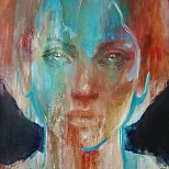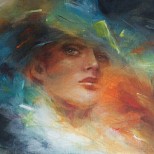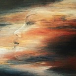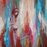 Langwerpig schilderij, gemaakt met acrylverf op doek met een dik frame. Er zit een textuur in de ondergrond. Het is abstractie gecombineerd met een vrouwelijk gelaat e bovenlijf. Het is romantisch vol warme kleuren.