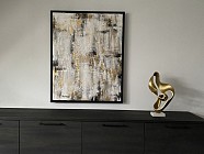 Mixed media,met goud en zilverblad. Afgewerkt met mat vernis. Ophangsysteem +zwarte baklijst.maat 85x105 is incl. Lijst. Dit kunstwerk is te bekijken / of te koop in deshowroom van Totalhome in Lelystad.